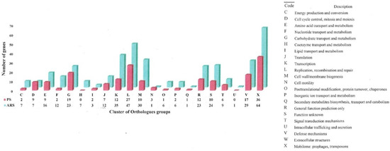 Distribution of unique genes in each Cluster of Orthologous Groups (COG) categories in clinical (PS; shown in pink) and non-clinical (ARS; shown in teal) Enterococcus cecorum isolates from chicken. The number of unique genes for each cluster is shown below the cluster code.