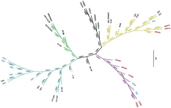 - Stamatakis, A. RAxML version 8: A tool for phylogenetic analysis and post-analysis of large phylogenies. Bioinformatics 2014, 30, 1312–1313. [Google Scholar] [CrossRef] [PubMed]