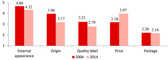 As can be seen in Figure 1, external appearance was the most important attribute for consumers in both 2004 and 2014 and the least important at both moments was the packing. The difference in lamb meat consumers’ preferences between 2004 and 2014 lies in the significance attached to price, with this being the fourth most important in 2004 but the second in importance in 2014. This change in the level of importance is probably due to the financial crisis affecting Spain between 2007 and 2017, given that, as reported in previous studies on periods of economic crisis, consumers are more sensitive to price [29,36,37]. A decrease in the quantities of food consumed and in the food spending because of the crisis were reported in Spain [43] with similar results in Greece [36]. In other severely affected countries, such as Portugal, it was observed an increase in the demand for generic products and cheaper brands [37].