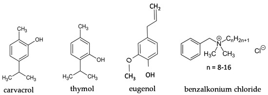 Carvacrol (CAR), thymol (THY), eugenol (EUG) and benzalkonium chloride (BAC) were purchased from Sigma-Aldrich (liquid, ≥98%, molar mass: 150.22 g/mol, density: 0.976 g/mL; product code: W224502), Penta Chemicals (powder, >99.0%, molar mass: 150.22 g/mol; product code: 27450-30100), Alfa Aesar (liquid, ≥98.5%, molar mass: 164.21 g/mol, density: 1.068 g/mL; product code: A14332), and Acros Organics (liquid, alkyl distribution from C8H17 to C16H33, density: 0.98 g/mL; product code: 215411000), respectively. With respect to the terpenoids (i.e., CAR, THY, and EUG), two stock solutions for each one were prepared in absolute ethanol at 10% and 40% (v/v for CAR and EUG; w/v for THY), for subsequent use against planktonic and biofilm cells, respectively, following appropriate dilutions (see below), while the stock solution of BAC (1% v/v) was prepared in sterile distilled water. All stock solutions were maintained at −20 °C for up to 1 month. The chemical formulas of the four tested compounds are presented in Figure 1, while Table 1 summarizes their main physical and chemical properties, together with the correlations in the concentrations (for each compound) expressed in either as ppm or molarity (M), using the 0.1% (v/v or w/v) as a reference concentration.