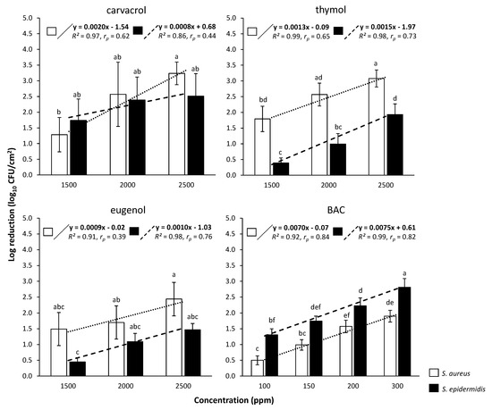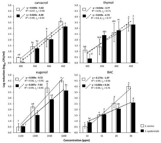 Log reductions (log10 CFU/mL) of planktonic cells for each bacterial species (□ S. aureus; ■ S. epidermidis) following 6 min exposure to each compound (i.e., CAR, THY, EUG, and BAC) applied at four different concentrations (ppm). The bars represent the mean values ± standard deviations. For each separate graph, mean values sharing at least one common letter shown above the bars are not significantly different (p > 0.05). Dotted lines illustrate linear regression correlations between the log reductions achieved (for each species) at each tested compound’s concentration. The mathematical equations of these regression plots, together with their regression coefficients (R2) and Pearson’s correlation coefficients (rp), are also shown.