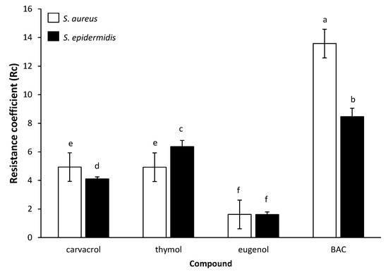 Resistance coefficients (Rc) of each compound for each bacterial species (□ S. aureus; ■ S. epidermidis). The bars represent the mean values ± standard deviations. Mean values sharing at least one common letter shown above the bars are not significantly different (p > 0.05).