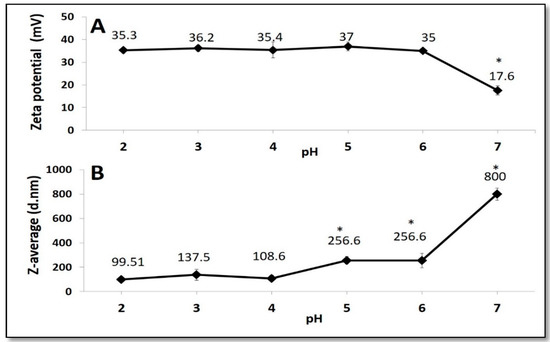 pH effect on Zeta potential (Panel A) and Z-average (Panel B) of 1 mg/mL chitosan nanoparticles (CH–NPs). Values marked with * were significantly different respect to the value at pH 2.0.