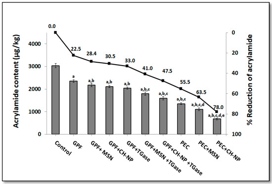 Influence of different hydrocolloid coatings on acrylamide content of fried kobbah (y-axis on the left based on fat-free dry matters (FFDM)) and% acrylamide reduction (y-axis on the right). “Control” represents kobbah sample dipped in distilled water. Columns “a” indicate values significantly different from the control sample; columns “b” indicate values significantly different from grass pea flour (GPF)-coated kobbah; columns “c” indicate values significantly different from GPF + mesoporous silica nanoparticles (MSN)-coated kobbah or GPF + transglutaminase (TGase)-coated kobbah; columns “d” indicate values significantly different from PEC-coated kobbah; columns “e” indicate values significantly different from pectin (PEC) + MSN-coated kobbah. Additional details are reported in the main text.