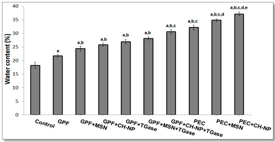 Water content of the kobbah (coated or not) was evaluated and the results reported in Figure 3. The obtained data have shown that the water content significantly increases in kobbah coated with any of the different hydrocolloid solutions used in this research. In fact, the lowest water content was found in the control sample (equal to 18%), while water content in coated kobbah by PEC-based solutions was (32.0%), significantly higher compared to the kobbah coated by GPF-based solutions (21.0%). Nanoreinforcement by using either MSN or CH–NP in both GPF-based or PEC-based solutions, provokes the increasing in water content of the kobbah significantly higher in comparison to samples coated by solutions made of only GPF or PEC. Our findings are supported by Osheba et al. [55], that concluded that CH–NP rise the moisture content of fish fingers up to 52.7%, while the uncoated samples exhibits 34.6% moisture. Regarding the use of TGase, our results prove that the enzyme action in both GPF-based and GPF + NP-based solutions show a significant higher water content respect to the kobbah coated without TGase. Comparable effects were observed by Rossi Marquez et al. [39], where TGase-mediated cross-links are responsible of the reduction of the water evaporation during frying. Moreover, the results demonstrate that the water content of kobbah coated by GPF + CH–NP + TGase is significantly higher compared to the kobbah coated by only GPF + TGase and GPF + MSN + TGase (Figure 3). Recently, Castelo Branco Melo et al. [56] found out that CH–NP led the delaying of the ripening process of the grapes as evident from the decreased weight loss, soluble solids and increased moisture retention.