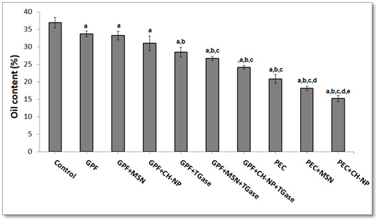 One of the main health problems is the highest oil content of fried foods. Several studies concluded that coating the fried foods before frying by hydrocolloids materials reduced the oil uptake during frying [39,57]. Figure 4 shows the oil content of kobbah just dipped into water (and used as control) or the ones coated with different solutions. Coating significantly reduces the oil content in comparison to the control, which shows the highest oil content (36.9%), whereas the lowest value was obtained in the fried kobbah coated by PEC + CH–NP (15.2%). There was not any significant difference between the GPF coated kobbah and the kobbah protected by GPF nanoreinforced with MSN or CH–NP. On the other hand, significantly difference in oil content of the fried kobbah were observed between PEC-coated samples and PEC + NP-coated samples. Enzymatically cross-linking of GPF, without and with NPs, demonstrated a significant oil uptake reduction in the coated fried kobbah compared to kobbah coated by GPF or in the presence of NPs (Figure 4). PEC-based coating materials containing NPs (either MSN or CH–NP) induced a significant reduction in oil content of the coated kobbah (18.1% and 15.2%, respectively) compared to kobbah coated with PEC (20.8%). Moreover, using CH–NPs for coating the fish fingers, Osheba et al. [55] have demonstrated a significant reduction of oil uptake which changed from 16.4% in uncoated fish fingers to 4.5% in coated ones.