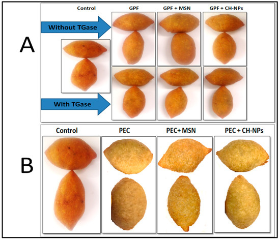 Images of kobbah samples coated by hydrocolloid coatings made of grass pea flour (GPF), GPF + mesoporous silica nanoparticles (MSN), GPF + chitosan nanoparticles (CH–NP), GPF + transglutaminase (TGase); GPF + MSN + TGase and GPF + CH–NP + TGase (Panel A); pectin (PEC), PEC + MSN and PEC + CH–NP (Panel B). “Control” represents the kobbah sample dipped in distilled water.