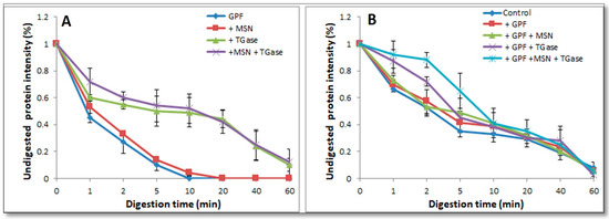 Densitometry analysis of those bands are observed in Figure 7, Panel B. The digestion seems to be slower in the food coated by protein crosslinked by means of TGase enzyme. However, all the proteins were completely digested by pepsin at the longest incubation time in all different coated kobbah (Figure 7, Panel B).