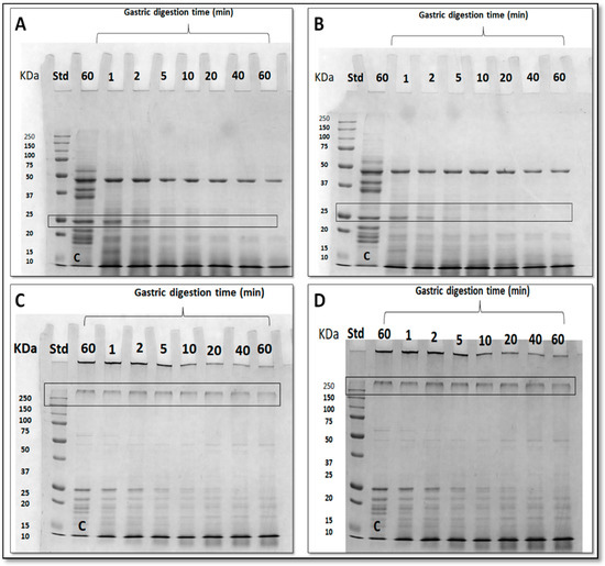 Sodium dodecyl sulfate polyacrylamide gel electrophoresis (SDS-PAGE) of grass pea flour (GPF) film forming solutions (FFSs) after in vitro digestion (IVD) experiments. (Panel A): GPF; (Panel B): GPF + mesoporous silica nanoparticles (MSN); (Panel C): GPF + transglutaminase (TGase 33 U/g); (Panel D): GPF + MSN + TGase (33 U/g). The bands in the rectangle are those chosen for densitometry analysis. C is control sample incubated with simulated gastric fluid (SGF) prepared without pepsin. Std, Molecular mass standards, Bio-Rad.