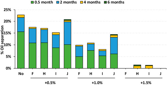 Comparison of oil separation at 30 °C over a 6-month period for the four most effective stabilizers selected in Figure 2. Each stabilizer was tested for three different composition amounts, 0.5%, 1.0% and 1.5%. Abbreviations are triglyceride (F) and 50% monoglyceride (H, I, J). The stabilizers are described in more detail in Table 1.
