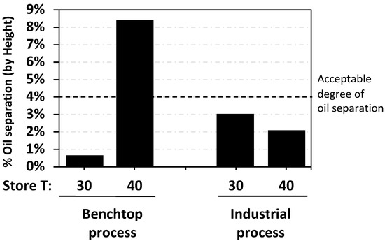 Comparison of oil separation of RUTF mixed with 1.5% of stabilizer H using the benchtop method and the industrial process and stored for 4 mos at 30 °C or 40 °C.