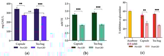 (a) TPC (mg GAE/L); (b) RSA (mM TE); (c) antidiabetic capacity (% α-glucosidase inhibition). For each panel results are reported before (Pre-Gastrointestinal Digestion (GID)) and after (Post-GID) GID for both capsule and tea bag coconut flavored beverages (E2), as well as results of ANOVA. Significance: ** = p < 0.01; *** = p < 0.001.