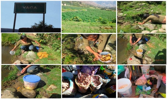 Solanum tuberosum L. (Family: Solanaceae) is one of the most important Andean crops, cultivated along the Andean mountain range of South America and spread to other regions worldwide []. Over time, Andean farmers have developed frost and drought-resistant crops, which can be planted at heights greater than 3800 m above sea level (m.a.s.l.). In Peru, there are around 3800 varieties of potato and it is one of the main contributors to the world. The potato was domesticated just under 10,000 years ago; staple food crops of the ancient Peruvians not only used fresh potato but also consumed the product in the fermentation state, named tocosh [].