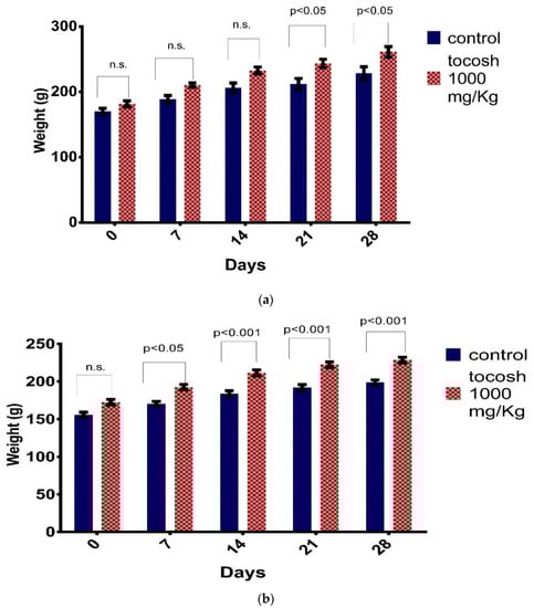 Body weights of rats treated with repeated oral doses of tocosh flour (1000 mg/kg) for 28 days. (a) male rats and (b) female rats. * p < 0.05, ** p < 0.001 compared to control, by using the Student t-test.