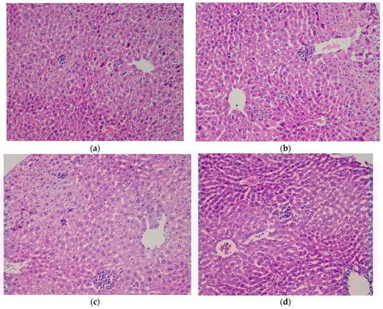Liver tissue images of mice receiving a fixed dose of 2000 mg/kg and 5000 mg/kg of tocosh flour. (Stained with H&E, 200×). (a) Male group at the dose of 2000 mg/kg. Liver parenchyma with few lymphocytes around the central vein. (b) Female group at the 2000 mg/Kg dose. Liver parenchyma with isolated lobular lymphocytes (mild lobular inflammation). (c) Male group at the dose of 5000 mg/Kg. Liver parenchyma with isolated lobular lymphocytes (mild lobular inflammation). (d) Female group at the dose of 5000 mg/kg. Liver parenchyma with isolated lobular lymphocytes (mild lobular inflammation).