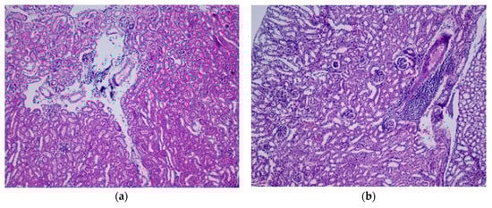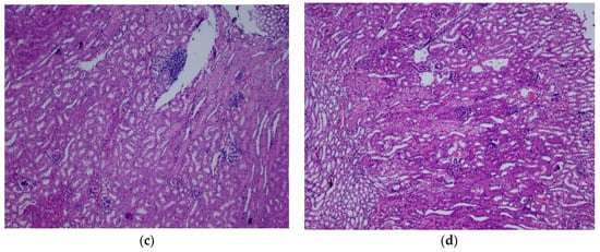 Renal tissue images of male and female mice that received a fixed dose of 2000 mg/kg BW and 5000 mg/kg BW of tocosh flour. (Stained with H&E, 200×). (a) Male group at the dose of 2000 mg/kg. Renal parenchyma with isolated chronic interstitial inflammatory infiltrate. (b) Female group at the dose of 2000 mg/kg. Renal parenchyma showing mild chronic interstitial inflammatory infiltrate with a tendency to lymphoid accumulation. (c) Male group at the dose of 5000 mg/kg. Renal parenchyma showing mild chronic interstitial inflammatory infiltrate with a tendency to the formation of lymphoid accumulation. (d) Female group at the dose of 5000 mg/kg. Renal parenchyma with isolated chronic interstitial inflammatory infiltrate.