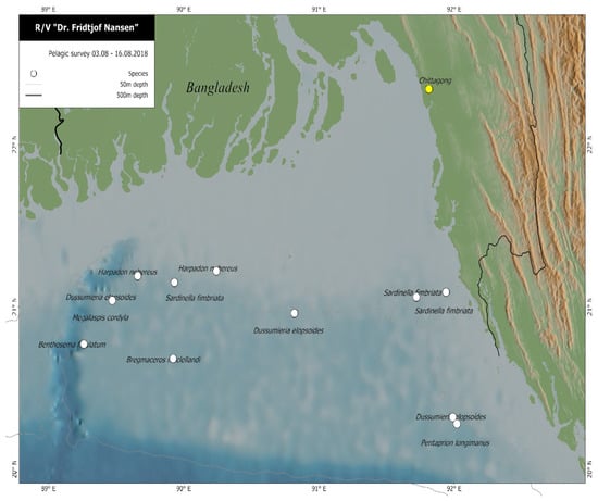 Sampling locations of the included fish species during the 2018 Nansen survey in Bangladesh, the Bay of Bengal.