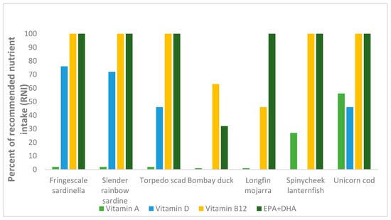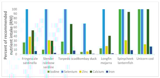 The various species’ potential contributions to the RNI of women of reproductive age for several micronutrients are presented in Figure 2 and Figure 3. With a consumption portion of 100 g raw edible parts, all species, except for the two demersal species Bombay duck and longfin mojarra, have the potential to contribute ≥100% to the RNI of vitamin B12 for women of reproductive age. Similarly, for EPA and DHA, all species, except for Bombay duck, may contribute ≥100% to the RNI. For vitamin A, most species may only contribute ≤10% to the RNI, except for the two mesopelagic species spinycheek lanternfish and unicorn cod, which were identified to potentially contribute ≥25% and ≥50%, respectively. For vitamin D, all sampled species may potentially contribute ≥40% to the RNI, except for the two demersal species, which both presented values <LOQ. Furthermore, all species, except for Bombay duck, may contribute ≥100% to the RNI of selenium. The two mesopelagic species were both identified to contribute ≥100% to the RNI of iodine, whereas the remaining species may contribute <25% to the RNI of this mineral. Both mesopelagic species may also contribute ≥100% to the RNI of calcium, whereas the rest of the species were all <30% in calcium levels. Neither of the species were identified to have the potential to contribute >15% to the RNI of iron.