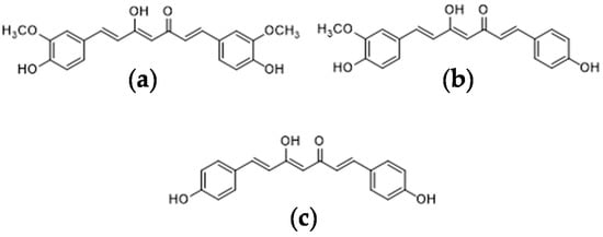 Chemical structures of curcuminoids: (a) curcumin (CUR), (b) demethoxycurcumin (DMC), (c) bisdemethoxycurcumin (BDMC).