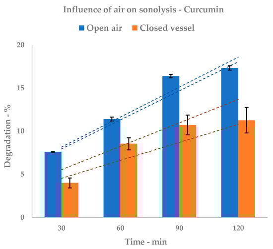 The concentration of curcumin decreases over sonication time, but its decrease is lower than when measured in open air. The graph depicted in Figure 5 shows behavior over time.