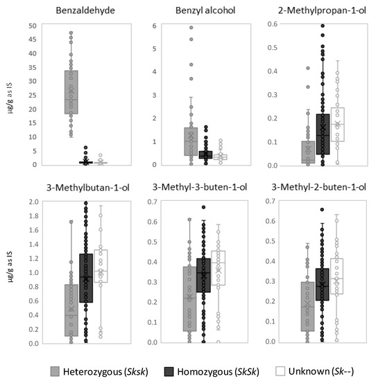 Table 3. Occurrence of main volatile compounds showing significant differences between genotypes (SkSk, Sksk) by Student’s t-test, presented as mean ± standard deviation. Correlation of volatiles with benzaldehyde (in SkSk, Sksk samples) are also shown.