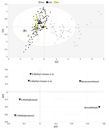 A multivariate statistical approach based on various potential genotype markers was carried out to support the differentiation allowed by benzaldehyde with the aim of providing a more reliable classification tool. PCA was carried out with the biomarkers previously selected by univariate analysis (3 Principal Components (PCs) accounted for 94.7% of the total variance explained, no outliers detected). While PC1 seemed to depend on varietal characteristics not linked to the bitter allele (data not shown), the scores and loadings plots corresponding to PC2 and PC3 confirmed that a clear differentiation between hetero- and homozygous individuals (Figure 2a) was driven by benzaldehyde and benzyl alcohol, and branched alcohols, respectively (Figure 2b). PC2 was the component that mainly contributed to the differentiation between hetero- and homozygous individuals (19.6% of explained variance). As expected, benzaldehyde was the variable that mainly contributed positively to this component, followed by benzyl alcohol (PC2 loadings 0.744 and 0.503, respectively), while 2-methyl propanol, 3-Methylbutan-ol, 3-Methyl-3-buten-1-ol and 3-Methyl-2-buten-1-ol were the ones mainly contributing negatively to this PC (PC2 loadings −0.310, −0.252, −0.140 and −0.113, respectively).