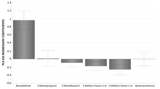 On this basis, to dispose of a classification tool for sweet almonds based on all volatile compounds whose biogenesis seemed to be linked to their genotype, a supervised discriminant technique was applied to find the maximum correlation between the data and each of the categories of interest (heterozygous vs homozygous). A PLS-DA classification model developed according to the almond genotype and based on the previously selected variables provided a 98.0% correct classification, as obtained by leave-10%-out cross-validation (Table 4). The corresponding predicted values are reported in Supplementary Table S5. The permutation test (n = 20) indicated that the model was not over-fitted according to the Q2 scores (Model’s Q2 = 0.81, permutation models’ Q2 < 0). Moreover, PLS-DA regression coefficients confirmed the major role of benzaldehyde in the classification model and evidenced the lower but significant contribution of some branched alcohols (Figure 3).