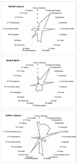 The results in Figure 1 show that the visual parameters, mainly the tonality and shade and transparency, are very important to define herbal liqueurs and spirits, more than in coffee liqueurs due to their very high intensity brown color, which makes it difficult to evaluate the other parameters, mainly transparency. According to Castañeda-Olivares et al., (2010) [52], the visual appearance in beverages is an important determinant for consumer appearance, and is associated as an indicator of quality. The tonality and shade in herbal liqueurs and spirits depends on the plants used in the elaboration, on the ethanol concentration and titratable acidity of the alcohol base, and on the soaking time during the maceration process [53].