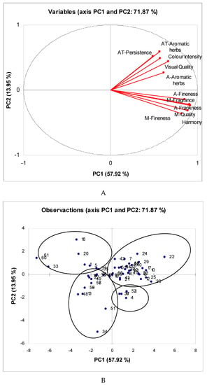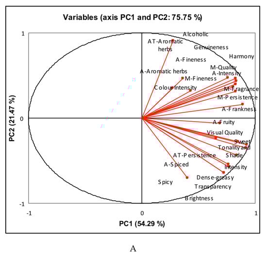The first component (PC1) was characterized by major and positive scores of the visual quality, aroma fineness, aroma frankness, mouth-quality, mouth-fineness, mouth-fragrance, and harmony, mainly qualifying terms. For the second principal component (PC2), the persistence in aftertaste showed the highest and positive value.