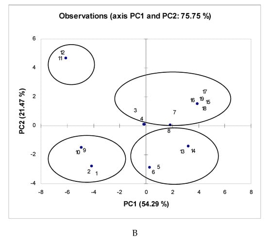 All parameters showed significant differences between the herbal spirits, so the first PCA was performed on the score of the total 24 descriptive and qualifying parameters included in the taste test evaluation form. The two first principal components, PC1 and PC2, accounted for 75.75% of the total variance (54.29% and 21.47%, respectively) (Figure 3A).