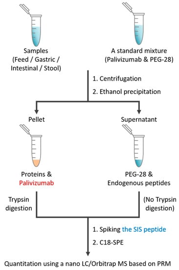 Figure 1. Proteins (including palivizumab) enriched by centrifugation and EtOH precipitation were digested by trypsin in order to make a surrogate peptide of the parent protein for PRM-based quantitation of the target protein. After proteolytic digestion, a synthetic stable isotope-labeled version of the unique palivizumab-derived peptide was immediately spiked in the samples to later correct for subsequent extraction and analytical variation of the unique palivizumab peptide. These samples were then mixed with the EtOH supernatant (which contained the PEG-28) from each original sample to allow simultaneous analysis of both peptides and PEG-28 in a single MS/MS run. In the EtOH supernatant, no unique palivizumab peptide selected herein was found via full MS/MS scanning, whereas PEG-28 was detected in abundance (