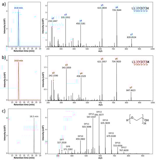 2 at lysine (K)) were clearly separated from PEG-28 by C18 column-based LC separation. As shown in the extracted ion chromatograms in