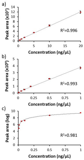Tryptic peptides of palivizumab and PEG-28 in samples and the standard mixture were purified by solid-phase extraction with C18 cartridges (Sigma Aldrich, St. Louis, MO, USA). Cartridges were washed with 5 mL of 80% acetonitrile (ACN; Merck, Darmstadt, Germany), 0.1% trifluoroacetic acid (TFA; Merck, Darmstadt, Germany) in nanopure water and reconditioned with 5 mL of nanopure water prior to loading the samples, which included the tryptic palivizumab peptides, the SIS peptide and PEG-28. After sample loading, the cartridges were washed with 5 mL of nanopure water to remove salts and interfering substances. Five milliliters of 80% ACN, 0.1% TFA in nanopure water were added to elute peptides and PEG-28. All samples and the standard mixture were dried by centrifugal evaporation at RT. Samples and the standard mixture were reconstituted with 30 μL and 100 μL of 3% ACN, 0.1% formic acid (Merck, Darmstadt, Germany) in nanopure water, respectively. To build the calibration curve, the standard mixture was diluted with the reconstitution solvent at 20,000×, 10,000×, 4000×, 2000×, 1000×, 400×, 200× and 100×. The concentrations of the standard series used were 0.5, 1, 2, 5, 10 and 20 ng/μL for palivizumab; 0.01, 0.05, 0.1, 0.2, 0.5 and 1 ng/μL for the SIS peptide; and 0.005, 0.01, 0.05, 0.1, 0.5 and 1 ng/μL for PEG-28.