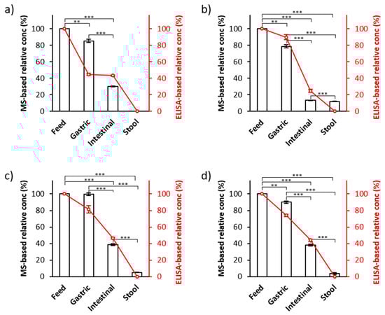 Figure 4). We compared the percentage survival of palivizumab across infant digestion (calculated as the palivizumab concentration measured in the digestive sample divided by the palivizumab concentration in the feed samples × 100) between MS- and ELISA-based quantitation. On average, 88.4% (standard error ± 4.4%) and 72.4% (±9.8%) of palivizumab originally present in the feed was found in gastric samples by PRM- and ELISA-based quantitation, respectively. In the intestinal samples, 30.0% (±5.9%) and 39.7% (±5.0%) of the original feed palivizumab concentration were observed in PRM- and ELISA-based results, respectively. For stool samples, 5.2% (±2.5%) and 0.01% (±0.01%) of the feed palivizumab concentration were observed in the PRM- and ELISA-based results, respectively. PRM- and ELISA-based quantitation showed similar, consistent degradation rates across the infant digestive samples. The palivizumab concentrations in all intestinal and stool samples were statistically different from their respective feed and gastric samples (