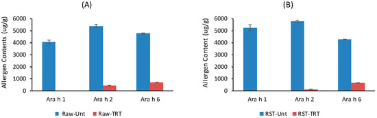 The concentrations of major allergen residues in peanut protein extracts ((A) raw peanuts, (B) dry roasted peanuts, RST—roasted, Unt—untreated, TRT—treated, Alcalase/Peanut = 3.5% (v/w), treatment time = 3 h).