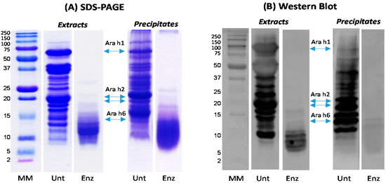 The ability of a peanut protein to bind the IgE-antibody in the plasma of peanut allergic patient is an indicator of its allergenic potential. The IgE-binding of peanuts extracts and their corresponding precipitates were tested by Western blot as described in our previous study [30]. Briefly, the protein extracts were diluted with PBS to 1 mg/mL the proteins which were loaded to 12%/4% acrylamide gel (25 mg/mL), resolved using a MiniProtein 3 Cell electrophoresis unit (Bio Rad, Hercules, CA, USA), and then transferred from the unstained SDS-PAGE gel to nitrocellulose membrane using Trans-Blot® Turbo Blotting System (Bio-Rad, Hercules, CA, USA). After blocking with 3% BSA-TBST (Tween 20 in tris buffer saline) for 1 h, the membrane was incubated with the pooled plasma (ImmunoCAP > 100, 1:60 diluted before use) of six peanut allergic patients (PlasmaLab International, Everett, WA, UAS) for 1 h with gentle agitation at ambient temperature. The membrane was then washed and incubated with properly diluted goat anti-human IgE peroxidase-conjugated antibody for 1 h, and then washed three times with TBST. The blot was developed with ECL substrate (Pierce, Rockford, IL, USA) according to the manufacturer’s instructions. The image of blot was taken using an Amersham Imager 600 (GE Healthcare, South Plainfield, NJ, USA).