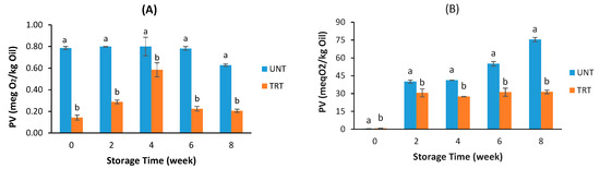 Effects of protease treatment on peroxide values of raw (A) and roasted (B) peanuts during storage (UNT—untreated, TRT—enzyme treated). At same storage time, the data bars with different letters are significantly different at p < 0.05.