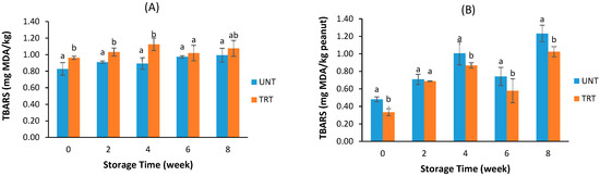 Effects of protease treatment on thiobarbituric acid reactive substances (TBARS) of raw (A) and roasted (B) peanuts during storage (UNT—untreated, TRT—enzyme treated). At same storage time, the data bars with different letters are significantly different at p < 0.05.