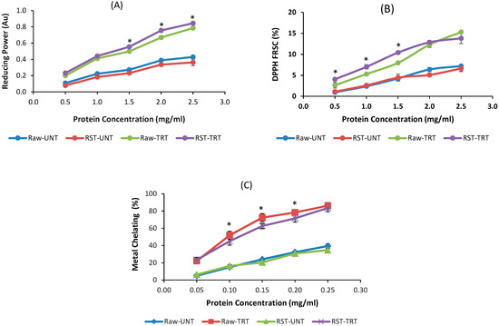 Effects of protease treatment on antioxidant activity of peanuts. (A) Reducing power, (B) DPPH free radical scavenging capacity, (C) metal chelating capacity (UNT—untreated, TRT—treated, Raw—raw peanuts, RST—roasted peanuts). The points with asterisks indicate significantly different values between Raw–TRT and RST–TRT.