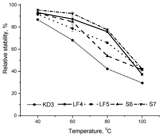Thermal stability of CAR during thermal treatment of CAR-CHIOS complexes KD3, LF4, LF5, S6 and S7 in the dark for 30 min at various temperatures and neutral pH. Each value was expressed as mean ± standard deviation (n = 3).