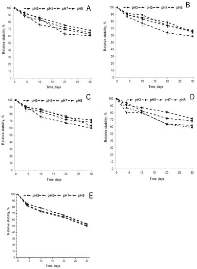 Under the storage in the light at 24 °C (Figure S2), the KD3 complex prepared by the kneading method exhibited the lowest stability, which differed insignificantly in the pH range 3–8. Overall, the half-lives of all complexes decreased comparing with the storage conditions in the dark at 24 °C. The complexes LF4 and LF5 prepared by freeze-drying method were unexpectedly more stable at the acid or slightly acid environment than at the neutral or slightly alkali medium. Overall, in the light at 24 °C the half-lives of β-carotene degradation in all our complexes were in the range of 9.83–26.87 days, while the half-life of β-carotene dissolved in ethyl acetate was 18.16 h at 21 °C [28]. The stabilization of β-carotene by the complexation with CHIOS is obvious.