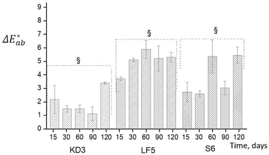 The total colour differences of CAR-CHIOS complexes KD3, LF5, S6 during the storage for 120 days in the dark at 4 °C. Each value was expressed as mean ± standard deviation (n = 3). Significant (§) differences of the values of colour parameter are determined using one-way analysis of variance (ANOVA, p < 0.05).