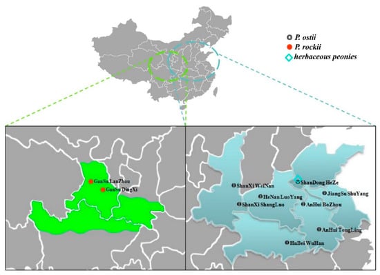 The sketch map of P. ostii and P. rockii distribution and the collecting sites of tree peony and herbaceous peony seeds in this work. GanSuLanZhou (GSLZ); GanSuDingXi (GSDX); ShanXiWeiNan (SXWN); ShanXiShangLuo (SXSL); HeNanLuoYang (HNLY); ShanDongHeZe (SDHZ); JiangSuShuYang (JSSY); AnHuiBoZhou (AHBZ); AnHuiTongLing (AHTL); HuBeiWuHan (HBWH).