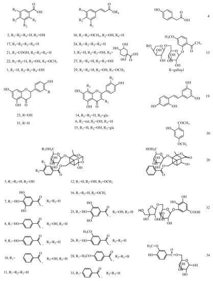 The benzoic acids (benzoic acid, p-hydroxybenzoic acid, phthalic acid, vanillic acid and gallic acid) were quantified with benzoic acid; cinnamic acids (cinnamic acid, caffeic acid, ferulic acid, sinapic acid and chlorogenic acid) were quantified with cinnamic acid; p-hydroxyphenylacetic acid was quantified absolutely with the corresponding standard; all the flavonoids, including naringenin, eriodictyol, vitexin, orientin and rutin, were quantified with naringenin; paeoniflorin was used to quantify all the Paeonia glycosides; paeonol and oxyresveratrol were quantified absolutely with the corresponding standards. This quantitative strategy is generally done in the literature, due to the unavailability of phenolic standards in most of the cases. Table 4 shows the individual compositions and Figure 3 shows the total contents of phenolic compounds of different classes, highlighting that the main classes were phenolic acids and Paeonia glycosides.