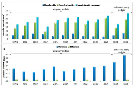 Clearly, the total contents of the phenolic compounds in Paeonia seed oils are shown in Figure 3a,b, which are comparable with those of extra virgin olive oil, camellia seed oil and tea seed oil, although the phenolic composition is different compared to these vegetable oils [,].