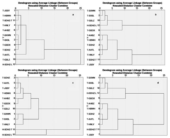 Hierarchical cluster analysis of Paeonia seed oils based on the data of composition: (a) fatty acids; (b) squalene, γ-tocopherol and sterols; (c) phenolic compounds; (d) all the components.