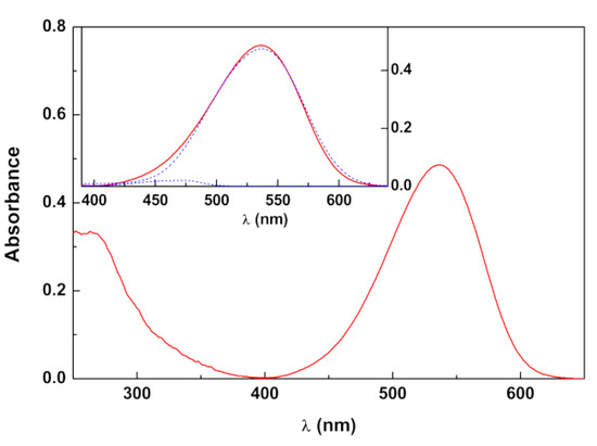 Based on UV-Vis absorption spectra of aqueous solutions of the lyophilized extracts, the anthocyanin content was previously estimated for red radish and hibiscus, together with the betalain content for red beetroot [40]. Regarding the new opuntia extract, the UV-Vis spectrum was fitted to a sum of the betacyanins spectrum (maximum at λ = 538 nm) and betaxanthins spectrum (maximum at 480 nm) (Figure 1, Table 1), as these classes of compounds have characteristic and distinguishable absorption spectra [43]. Using the reported spectra for each of the components [43], the content of each dye was determined by Equation (1), and expressed as mg equivalent betanin/L and mg equivalent indicaxanthin/L, respectively [44,45]. A very low content of betaxanthins in the opuntia extract could be observed, betacyanins being the dominant class of dyes in this plant extract.