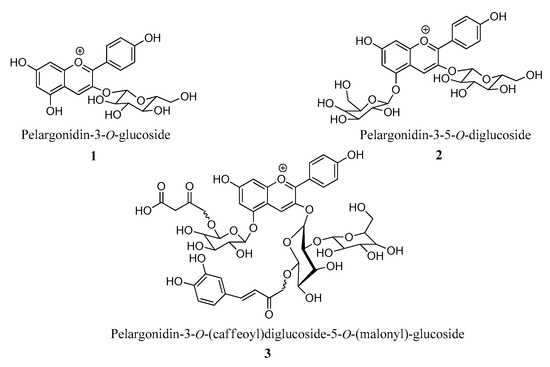 Structures of pelargonidin derivatives 1–3 putatively present in red radish extract.