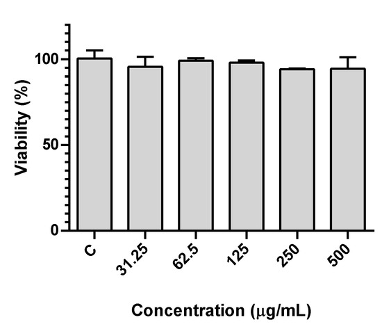 For assessing viability, cells were plated at a density of 1.5 × 104 cells/well, followed by incubation for 24 h with the samples. After incubation, 0.5 mg/mL MTT solution was added and further incubated for 2 h. The formazan in each well was dissolved in a solution of DMSO/isopropanol (3:1). Lastly, the absorbance at 560 nm was read in a Thermo Scientific™ Multiskan™ GO microplate reader (MA, USA). Viability was expressed as a percentage of the signal of control cells (cell medium).