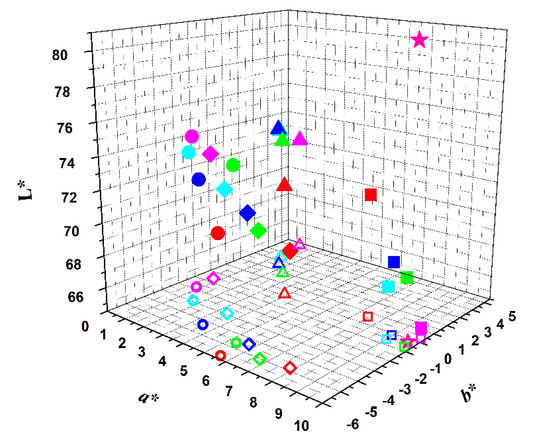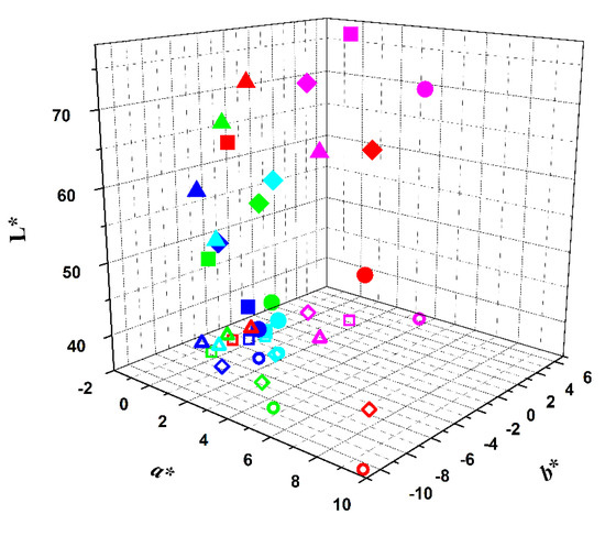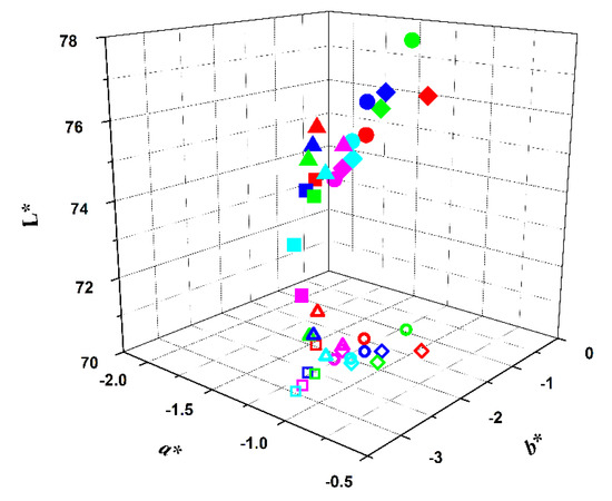 Representation of the colors of the several samples in L*a*b* color scheme, immediately after extract addition (red symbols), and after 1 day (green symbols), 7 days (blue symbols), 14 days (cyan symbols) and 21 days (magenta symbols) of storage at 4 °C. Projection in a*,b* plane: open symbols.